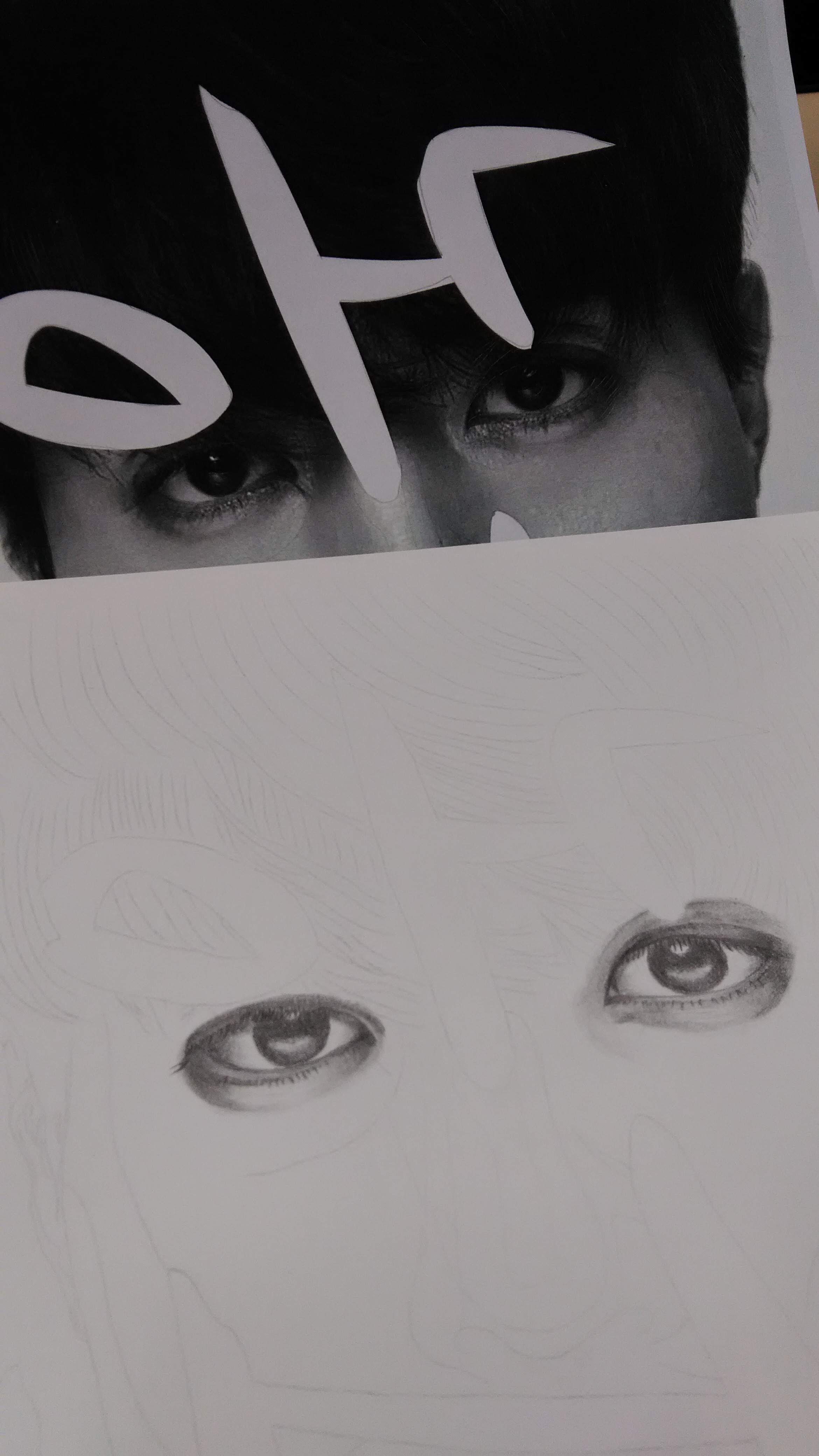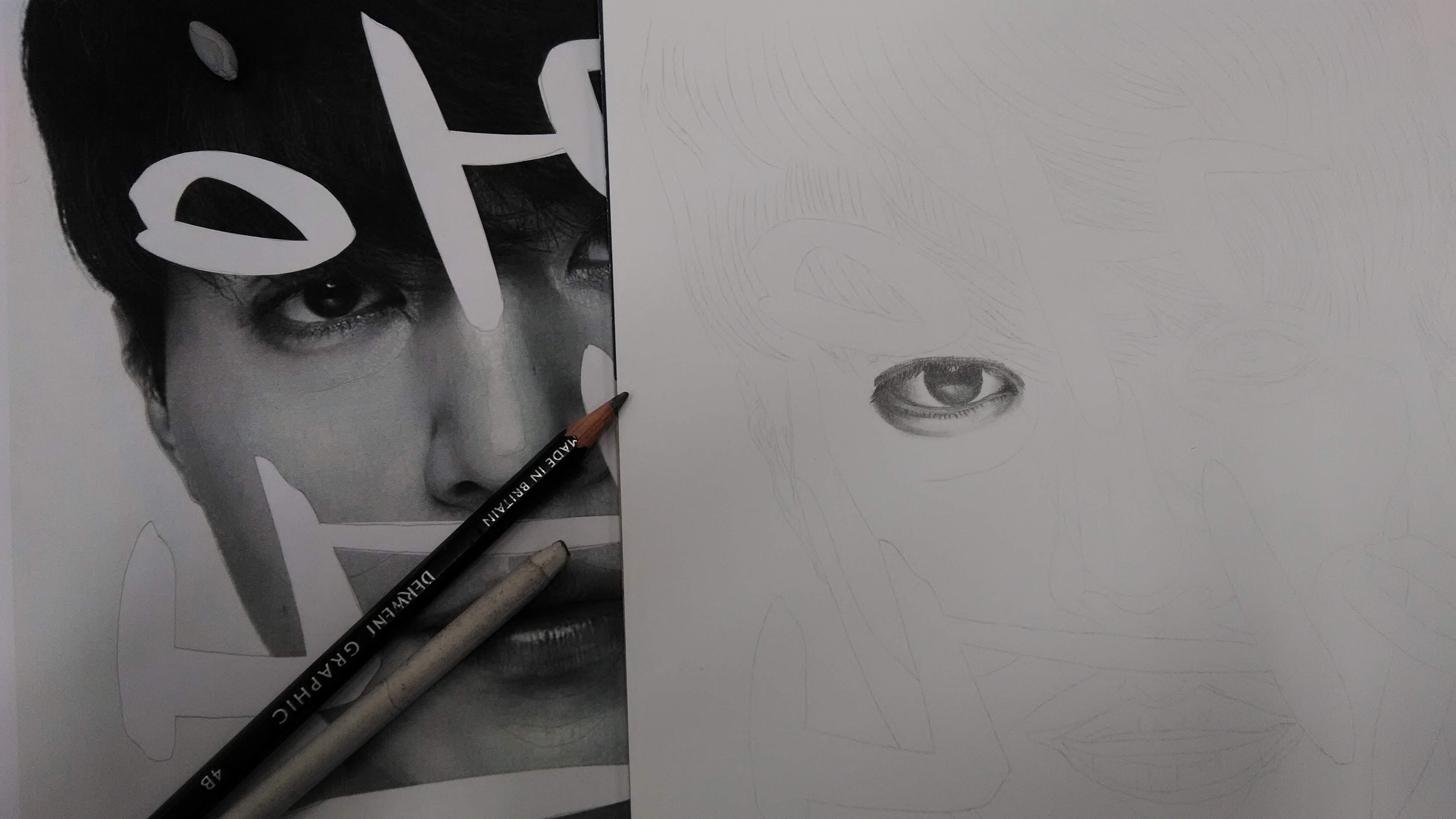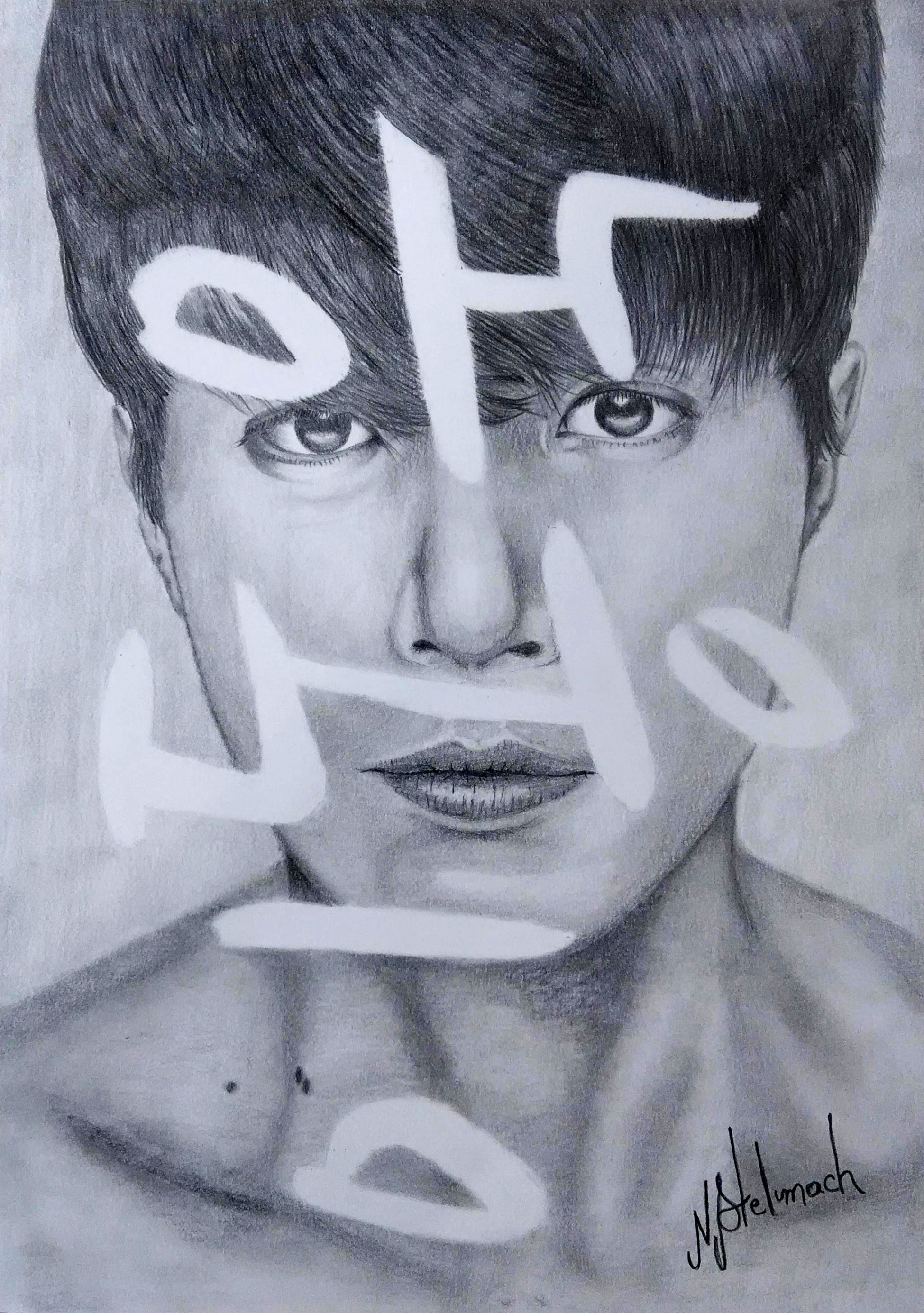 Tomei a liberdade de, ao seguir uma foto referência de internet para essa obra, me permitir criar o nome do ator em negativo sobre o seu próprio rosto, na horizontal, e no alfabeto coreano manual.